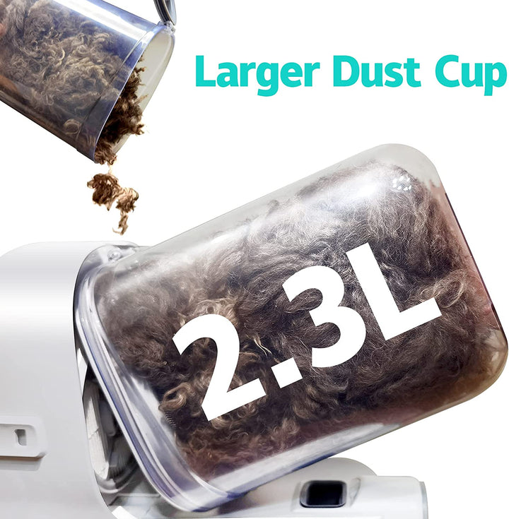- đ¶ă2.3L Larger Dust Cupăâ The larger jar storage capacity can reduce the number of times you dump your pet hair. This is fantastic because you can brush her inside without fur flying everywhere, instead it goes directly in the canister. It is also very simple to disassemble and clean.